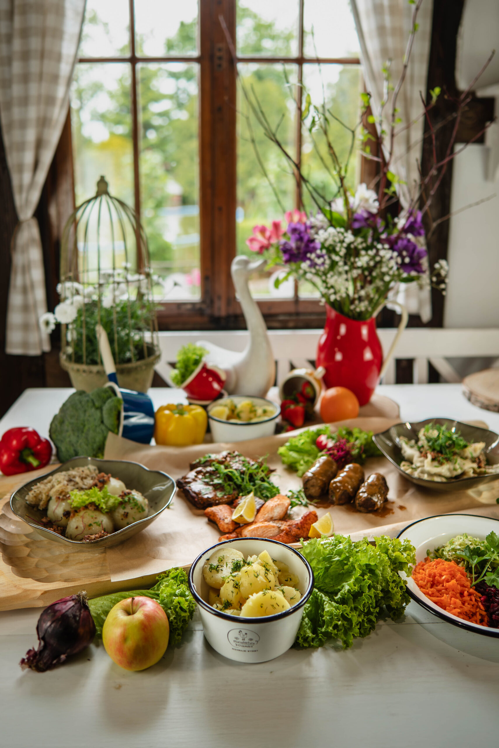 Warzywa, zioła, owoce pochodzą z naszego ogrodu. Serwujemy wyłącznie dania świeże, przygotowywane bez podgrzewaczy, czy kuchni mikrofalowych toteż czas oczekiwania na posiłki jest nieco wydłużony. Mamy nadzieję ,że tę niedogodność zrównoważy jakość naszych potraw.